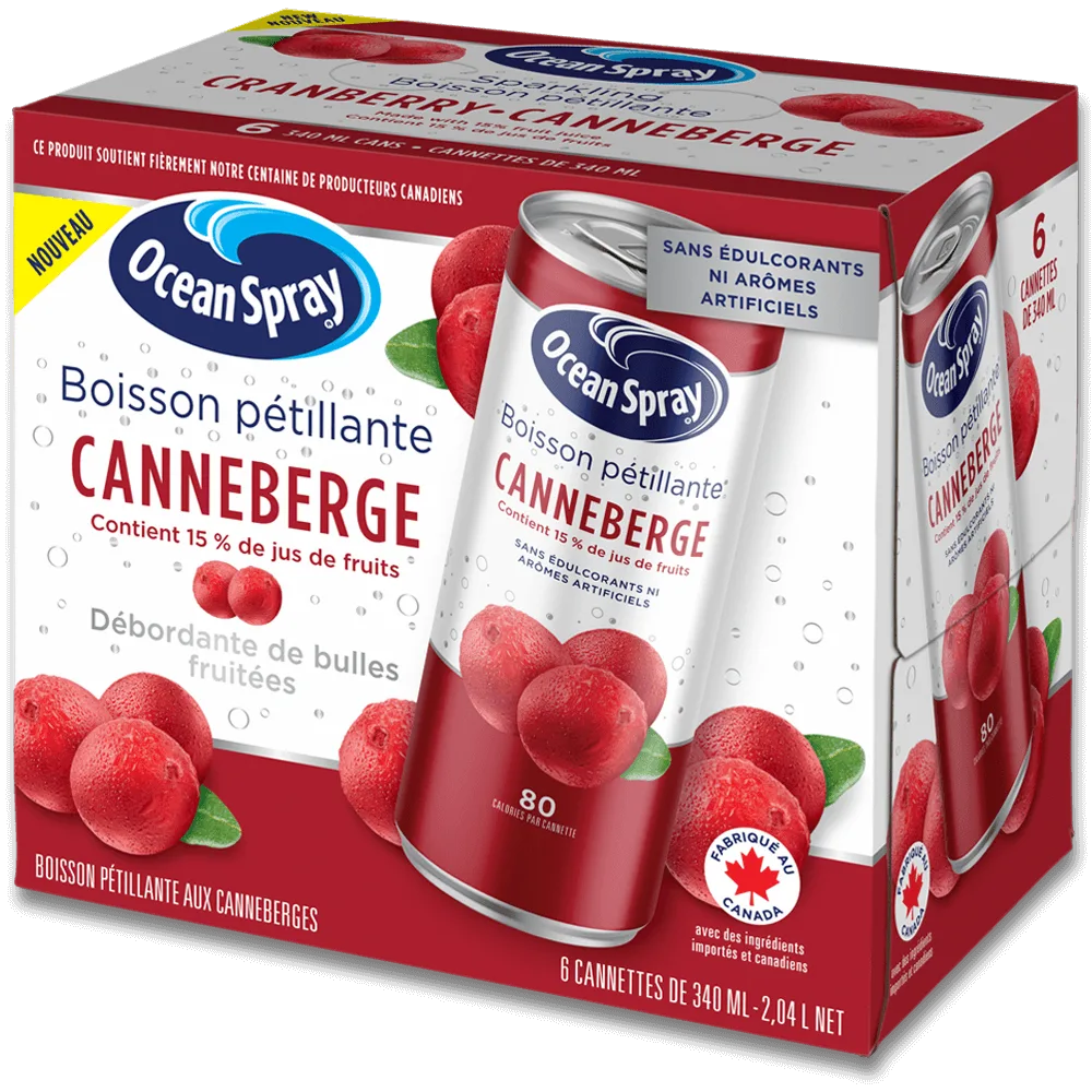 La boisson pétillante aux canneberges d’Ocean Spray® déborde de bulles fruitées! Savourez le goût naturellement franc de la canneberge agrémenté de bulles pétillantes pour profiter du plus savoureux des rafraîchissements. Elle est faite de vrais jus de fruits, sans édulcorants ni arômes artificiels, de quoi se sentir bien. Vous trouverez les boissons pétillantes Ocean Spray® dans le rayon des boissons pétillantes prêtes à savourer à la maison ou en déplacement!
