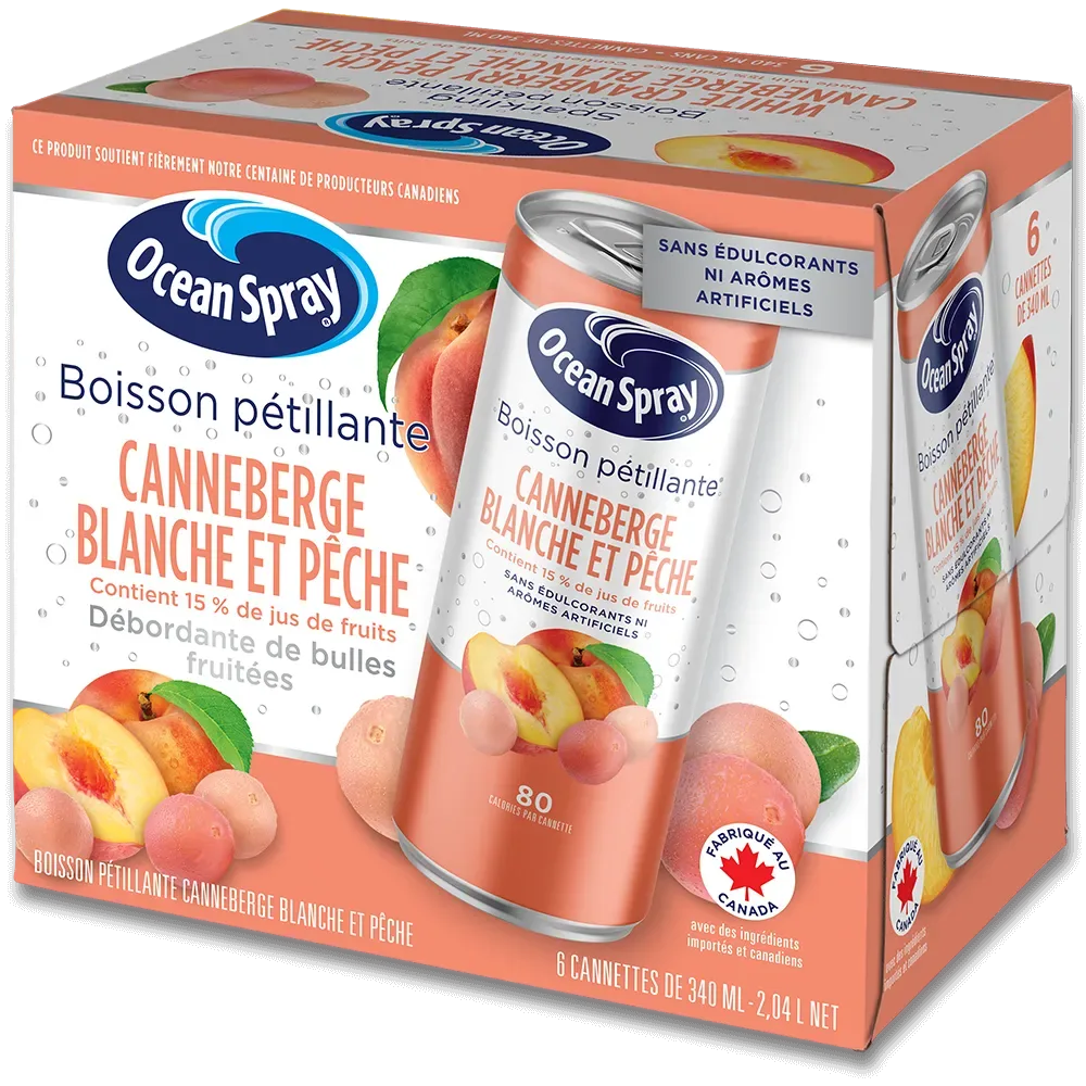 Plongez dans une explosion de saveur avec la boisson pétillante Canneberge blanche et pêche d'Ocean Spray®. Ce délice pétillant combine le goût légèrement acidulé et rafraîchissant de la canneberge blanche avec la saveur sucrée et juteuse de la pêche. Elle ne contient ni conservateurs, ni édulcorants artificiels, ni arômes artificiels et est fabriquée au Canada avec des ingrédients locaux et importés. Seule, comme base de cocktails originaux, ou mélangée à des friandises fraîches et glacées, c'est un choix rafraîchissant et sans compromis.