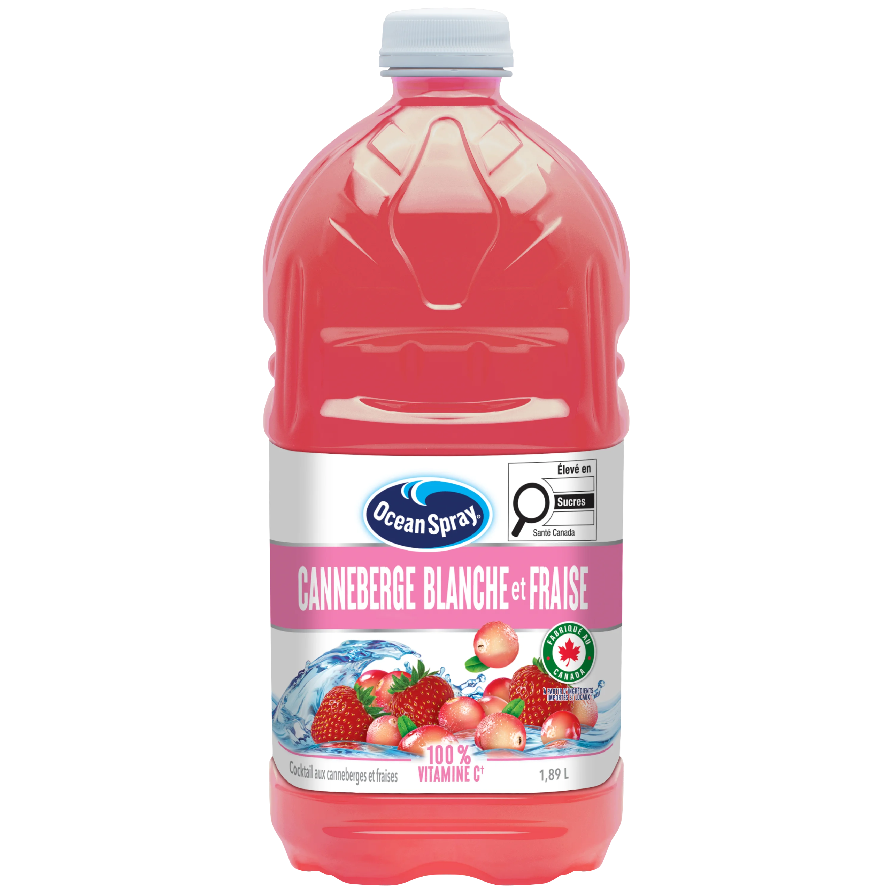 Adoucissez chaque instant avec la boisson au jus de canneberge blanche et de fraise Ocean Spray®. Légère et rafraîchissante, cette boisson allie la fraîcheur et le caractère affirmé des jus de canneberge blanche et de fraise. Une seule portion de cette boisson aux fruits vous apporte 100 % de l’apport quotidien recommandé en vitamine C. Savourez la saveur sucrée et délicieuse du jus de canneberge blanche et du concentré de jus de fraise. Au fait, saviez-vous que la boisson au jus de canneberge blanche et de fraise Ocean Spray® est fabriquée sans sirop de maïs à haute teneur en fructose ? C’est vraiment gagnant-gagnant. Utilisez cette boisson à base de jus de canneberge pour préparer des cocktails raffinés ou servez-la telle quelle, bien fraîche. La canneberge blanche apporte également une touche délicieuse et unique aux boissons mélangées et aux sucettes glacées. N’hésitez pas à faire preuve de créativité. Cette boisson au jus ne vous décevra pas. Tout cela est rendu possible grâce aux 100 familles canadiennes de producteurs de canneberges qui composent notre coopérative. Nos propriétaires. Notre raison d’être. Notre inspiration. Ocean Spray croit au pouvoir de la puissante canneberge. Fabriqué au Canada à partir d’ingrédients importés et canadiens.