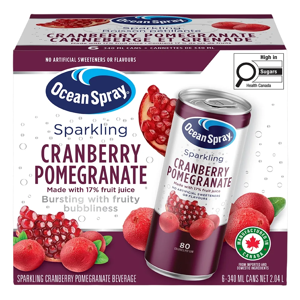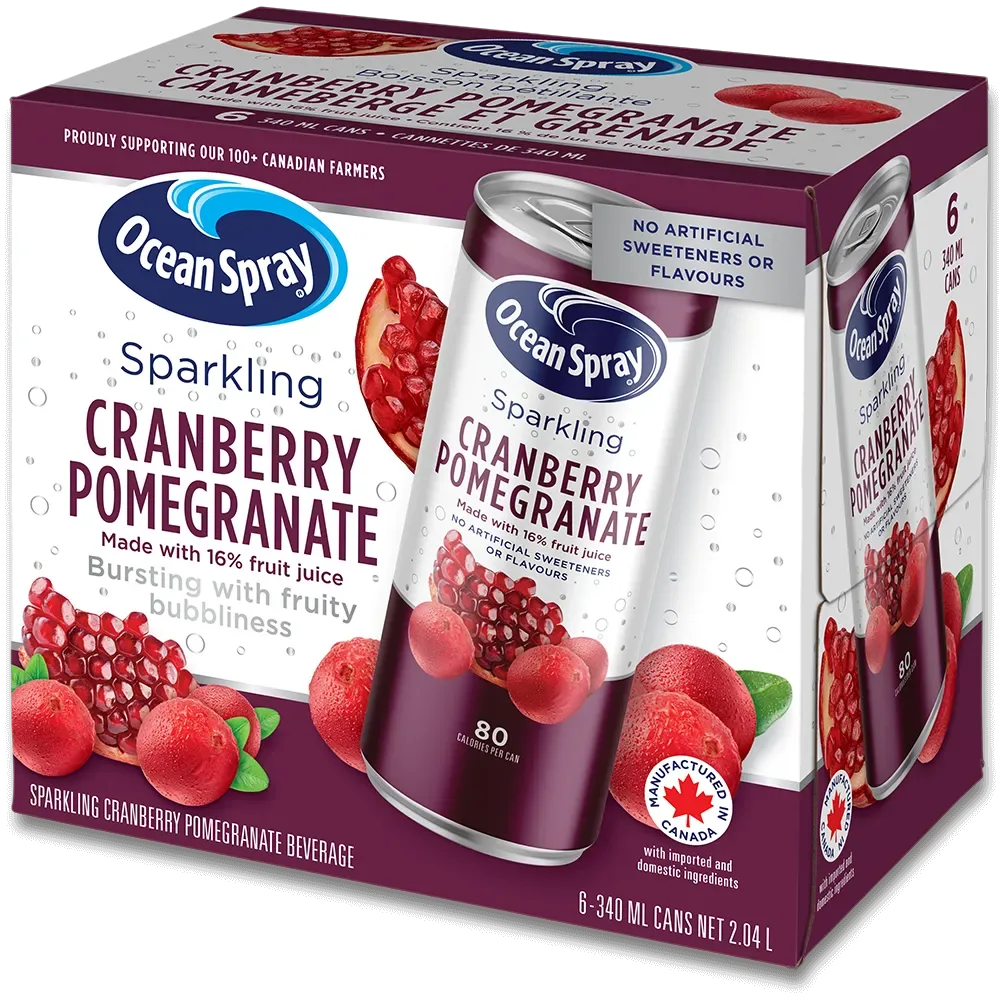 Crack open a can of Ocean Spray® Sparkling Cranberry Pomegranate Beverage and let the bold, refreshing bubbles take over! With the perfect balance of tart cranberry and sweet pomegranate, this drink is packed with flavour that’s as bold as it is refreshing. Bursting with fruity fizz, it’s made from real fruit juice concentrate with no preservatives, artificial sweeteners or flavours. Plus, it’s manufactured in Canada from domestic and imported ingredients. Whether you’re mixing up a cocktail, freezing into ice pops, or sipping straight from the can, this sparkling delight is here to keep you refreshed and ready for anything!