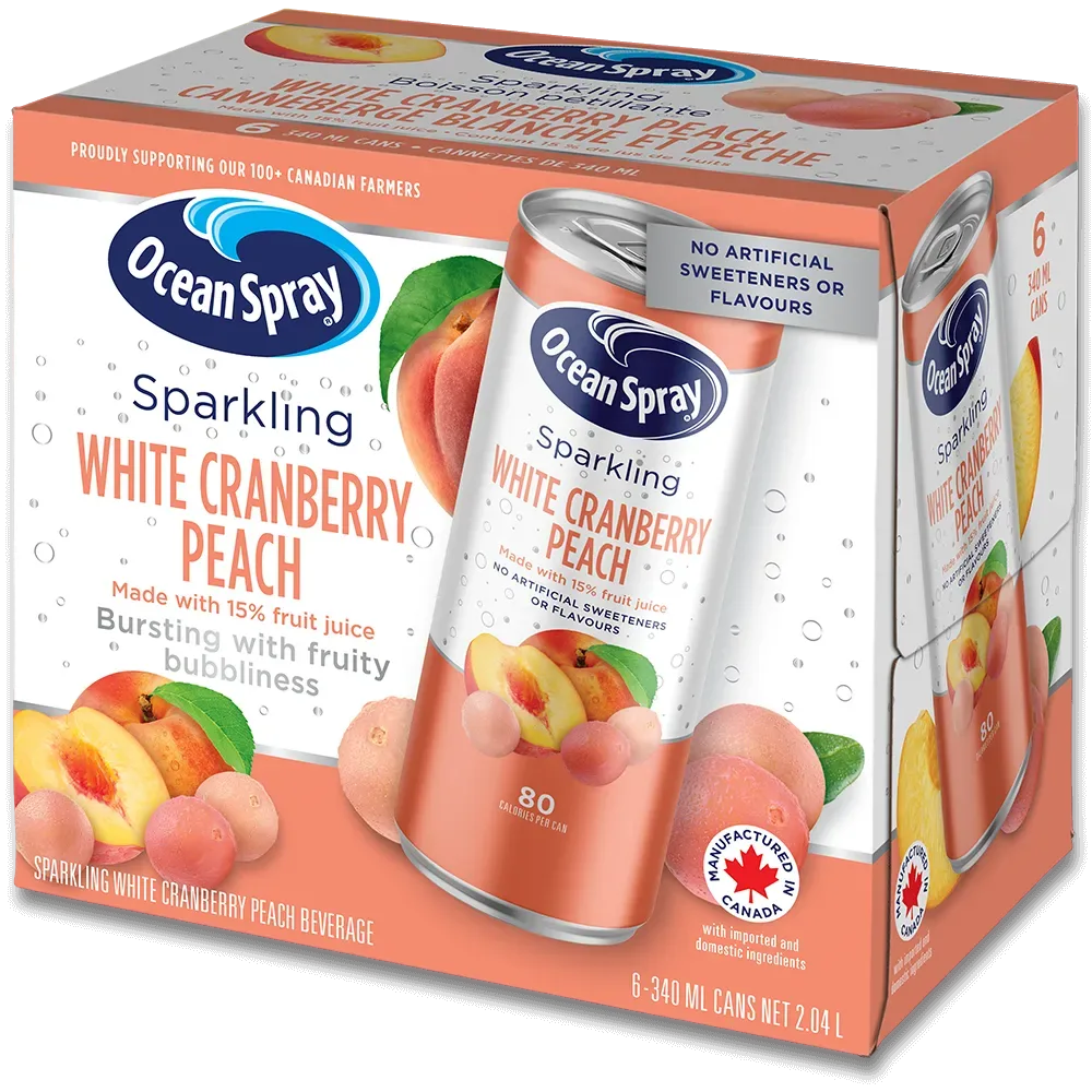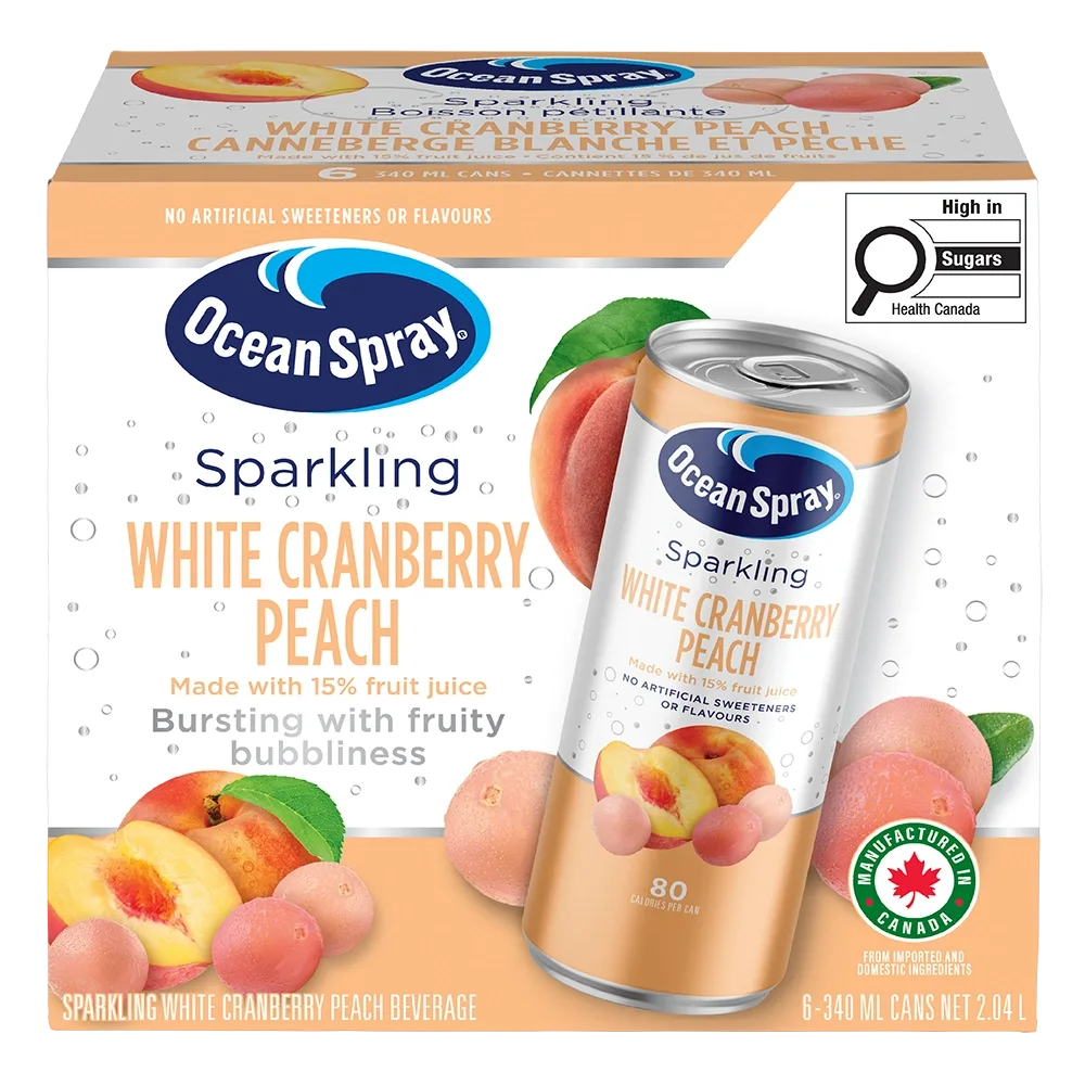 Dive into a splash of flavour with Ocean Spray® Sparkling White Cranberry Peach Beverage. This bubbly delight combines the crisp, refreshing zing of white cranberry with the sweet, juicy kick of peach. It has no preservatives, artificial sweeteners, or artificial flavours, and is manufactured in Canada from domestic and imported ingredients. Perfect on its own, as a mixer for cocktail masterpieces, or blended into cool, icy treats, it’s a clean, refreshing choice you can feel good about.